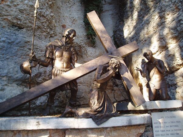 По этой дороге движутся только пешком, и на этой дороге воспроизведены четырнадцать станций на Крестного пути в виде бронзовых статуй, а в конце установлена гробница, в которую был помещен Иисус после его смерти[3].