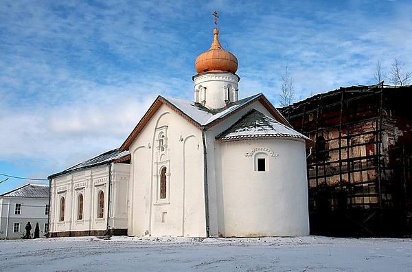 Ныне существующий каменный Никольский храм был возведён в XV веке[5]. Впервые как каменный он упоминается в писцовых книгах после восстановления обители в 1625 году[3]. В 1613 году, в период Смутного времени, монастырь был разорён шведскими войсками и восстановлен спустя 12 лет[8].