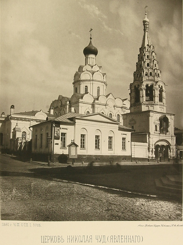 По преданию, церковь была возведена в 1593 году по распоряжению царя Бориса Годунова на углу Арбата и Серебряного переулка, в месте изгиба Арбата, поэтому просматривалась с обеих сторон улицы — эта древняя церковь, построенная каменной, была снесена в 1846 году. Существовало поверье будто икона Николая Чудотворца, хранившаяся в храме, «являла» чудо исцеления больным; поэтому храм называли «Новой Прощей» или «Явленным». Эта икона почиталась царской семьёй и на протяжении XVII—XVIII веков церковь пользовалась особым вниманием с её стороны. Так императрица Елизавета Петровна пожаловала храму список Ахтырской иконы Божией Матери и для этой иконы в 1761 году на средства капитана Дурново был устроен придел Ахтырской Богоматери.