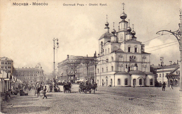 Охотный ряд, в котором стояла Пятницкая церковь, был оживлённым торговым местом. В разные периоды времени здесь располагались Мучной, Житный, Солодовеный торговые ряды, а сама улица — Охотный ряд, была названа по ряду, в котором торговали дичью и битой птицей.