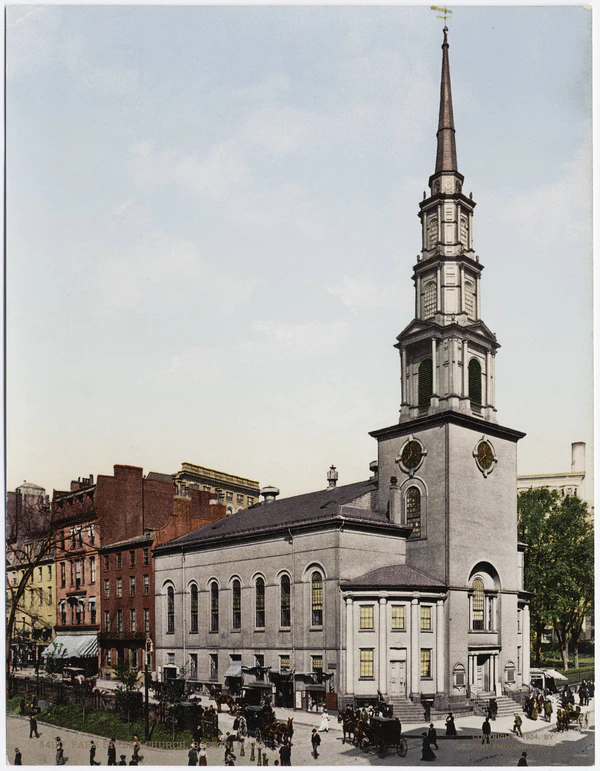 Место для строительства новой церкви было выбрано в марте 1809 года — у пересечения улиц Парк (Park Street) и Тремонт (Tremont Street), где ранее находилось бостонское зернохранилище[2].