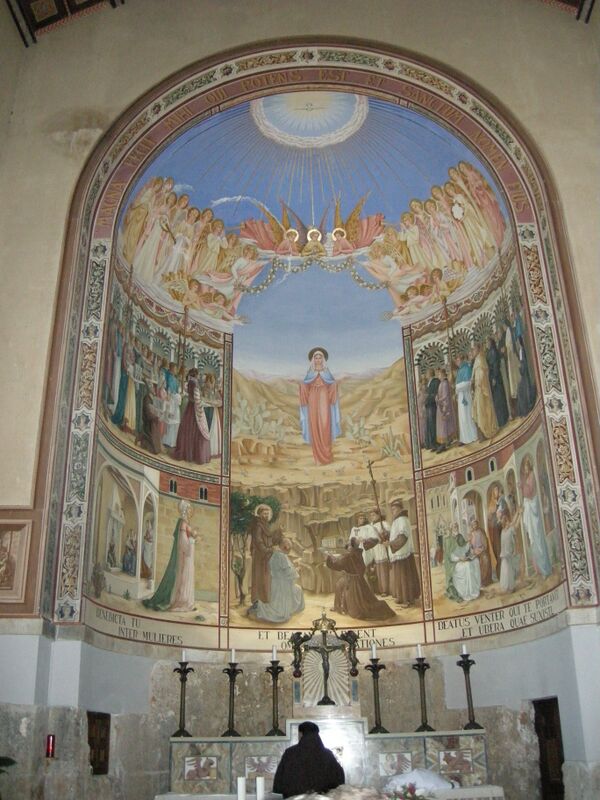 Верхняя церковь, созданная по проекту Барлуцци, богато украшена фресками авторства Ц. Вагерини. Сюжеты фресок на пяти больших панно посвящены Деве Марии: «Эфесский собор, провозгласивший Марию Богородицей»; «Покровительница всех верующих»; «Посредница и Заступница» — сцена свадьбы в Кане Галилейской; «Патронесса христиан» — папское благословение на битву при Лепанто и «Непорочная Приснодева» — диспут о Непорочном зачатии[9]. Своды апсиды над главным алтарём украшает живописное изображение Девы Марии в окружении ангелов и святых.