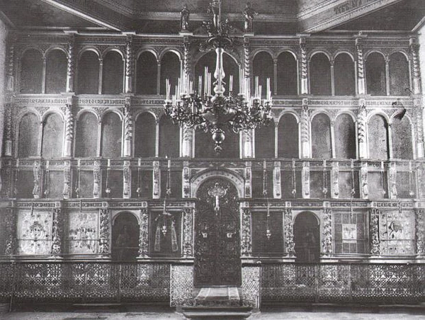 Напротив главного алтаря на колоннах были устроены хоры, а под ними так называемые «женские» места. Основная часть храма соединялась с приделами, через арки, устроенные также при перестройке храма в 1845 году.