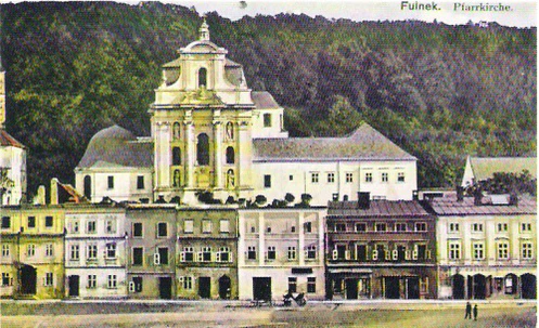 Старая приходская церковь, посвящённая святым Филиппу и Иакову, стояла на месте сегодняшней часовни св. Иосифа, на левой стороне храмового нефа. Неизвестно, когда она была построена; первое документальное подтверждение относится к 26 февраля 1293 года в документе господина Ольдржиха из Лихтенбурка (Oldřich z Lichtenburka), потомка влиятельного рода Роновцев (Роновичей) (Ronovci) и собственника Фульнецкой области, согласно которому он продаёт бургомистру Штедроню (Štědroň) из Йиловца (Jílovec) здание городской управы.[1]