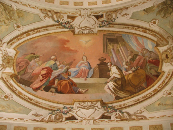 Большинство картин в церкви выполнил Игнат Викторин Раб (Ignatz Viktorin Raab), но роспись главного алтаря — произведение Феликса Иво Ляйхера (Felix Ivo Leicher). Святой Августин на нём держит перо, оставляющее за собой огненный след, что символизирует вдохновение Святым Духом[19]. Дверь дарохранительницы украшена изображениями пеликана, кормящего голодных детёнышей собственным мясом — притча Христа, насыщающего людей через Святые Дары своим телом.