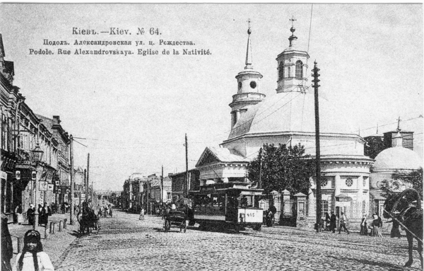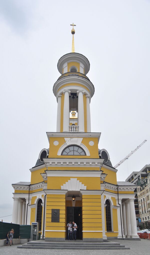 После страшного подольского пожара 1811 года, все улицы Подола были перепланированы по проекту Гесте. Новая главная улица Подола, по этому проекту (часть бывшей Александровской, а теперь — улица Сагайдачного), протянулась вдоль западной стороны церкви. Таким образом задний фасад превратился в основной, а бывший главным фасад (с высоким портиком на стилобате) оказался скрытым в середине застройки квартала. Новая улица расположилась таким образом, что западный портик, колонны которого очутились утопленными в землю, выдвинулся за её красную линию. Получилось, что колонны очутились на нешироком тротуаре. Прокладка Владимирского спуска привела к ещё большему увеличению уровня улицы по сравнению с храмом.