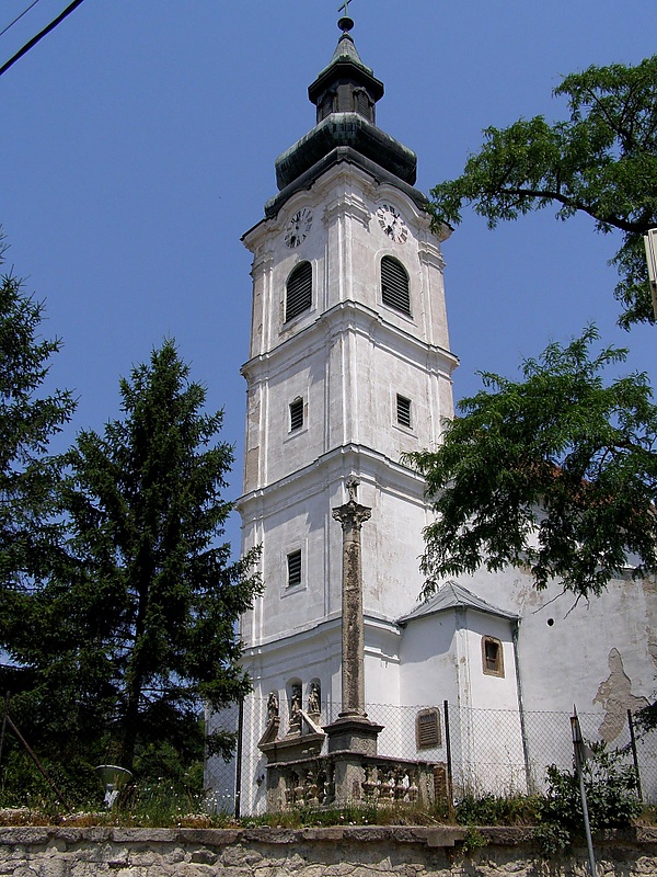 Башня храма имеет двойную луковичную главу и разделена горизонтальными выступами (тягами) на три этажа. В разорванном фронтоне над главным порталом на пьедесталах установлены скульптуры Святого Франциска, Девы Марии и Святого Флориана.