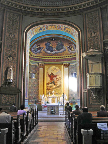 В 1891 году Франтишек Сторно улучшил здание церкви. Он разработал проект цветных окон, которые через год были изготовлены в Шопроне. Первоначально окрашенный в белый цвет, в 1927 году церковный художник Ф. Грюнвинд расписал внутреннее убранство церкви фигуральными фресками, подарив интерьеру классический характер.
