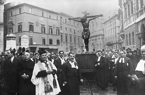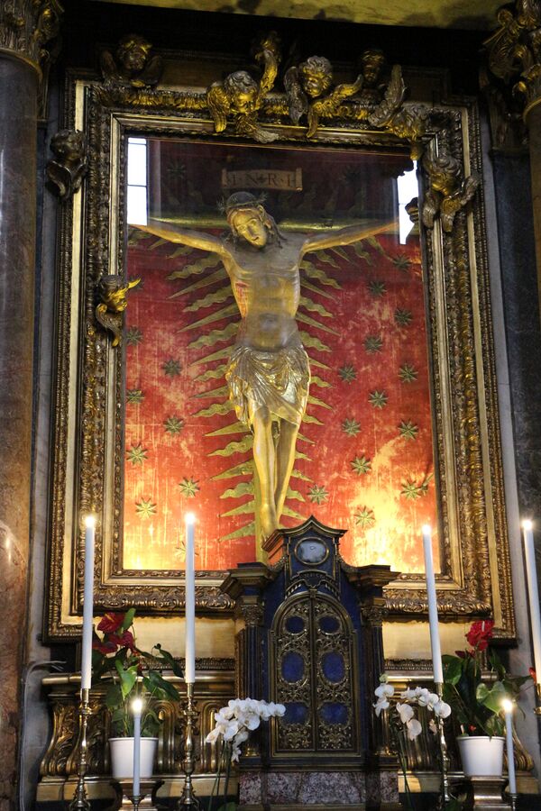 22 мая 1519 года церковь уничтожил пожар. В огне уцелело старинное деревянное распятие XIV века. Факт казался чудесным, так возникла «молитвенная группа», получившая название «Товарищество Святейшего Распятия» (Compagnia del SS. Crocifisѕо). Через три года, в 1522 году, город поразила чума. Распятие вынесли из монастыря, в котором оно находилось, и носили с процессией по городу в течение шестнадцати дней, с 4 по 20 августа, по окончании которых эпидемия прекратилась, и поэтому распятие стали называть «Чумной крест». «Процессию Распятия» (La processione del Crocifisso) стали повторять на протяжении веков в Великий Четверг по маршруту от церкви Сан-Марчелло до площади Сан-Пьетро (в 1568 году «Компания» переехала в близлежащую Молельню Распятия (Oratorio del Crocifisso)[4].