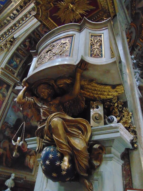 Необычно вогнутый двухъярусный фасад церкви соответствует «классической» композиции высокого римского барокко: сдвоенные колонны коринфского ордера, поднятые на высокие цоколи, мощно раскрепованный антаблемент, разорванный фронтон, статуи в нишах, на фронтоне и на парапете второго яруса[6].