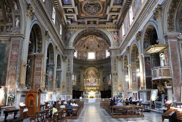 Современная церковь представляет собой однонефный храм с плоским кессонным потолком. Интерьер оформлен в привычных формах римского барокко: богатство света, цвета, позолоты и разноцветных мраморов. Пять боковых капелл открываются в сторону нефа. Широкая триумфальная арка отделяет апсиду от нефа. Богато украшенный резьбой, росписью и позолотой Кессонный потолок датируется 1592 годом. Над порталом на внутренней стене находится большое Распятие, созданное в 1613 году Джованни Баттиста Риччи. Слева от входа находится двойная гробница работы Якопо Сансовино, созданная около 1519 года для Антонио Орсо и кардинала Джованни Михиеля, племянника папы Павла II[7].