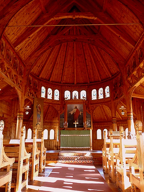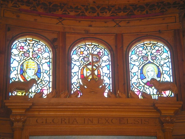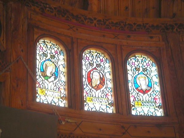 Полукруглую стену хора украшают девять витражей с изображением святых. Из этих святых трое имеют непосредственное отношение к становлению христианства в Норвегии св. Олав, св. Халльвард и св. Суннива, и особо почитаемы в стране. Другие — Дева Мария, св. Колумба, св. Климент, св. Бригитта, св. Свитин и св. Георгий.