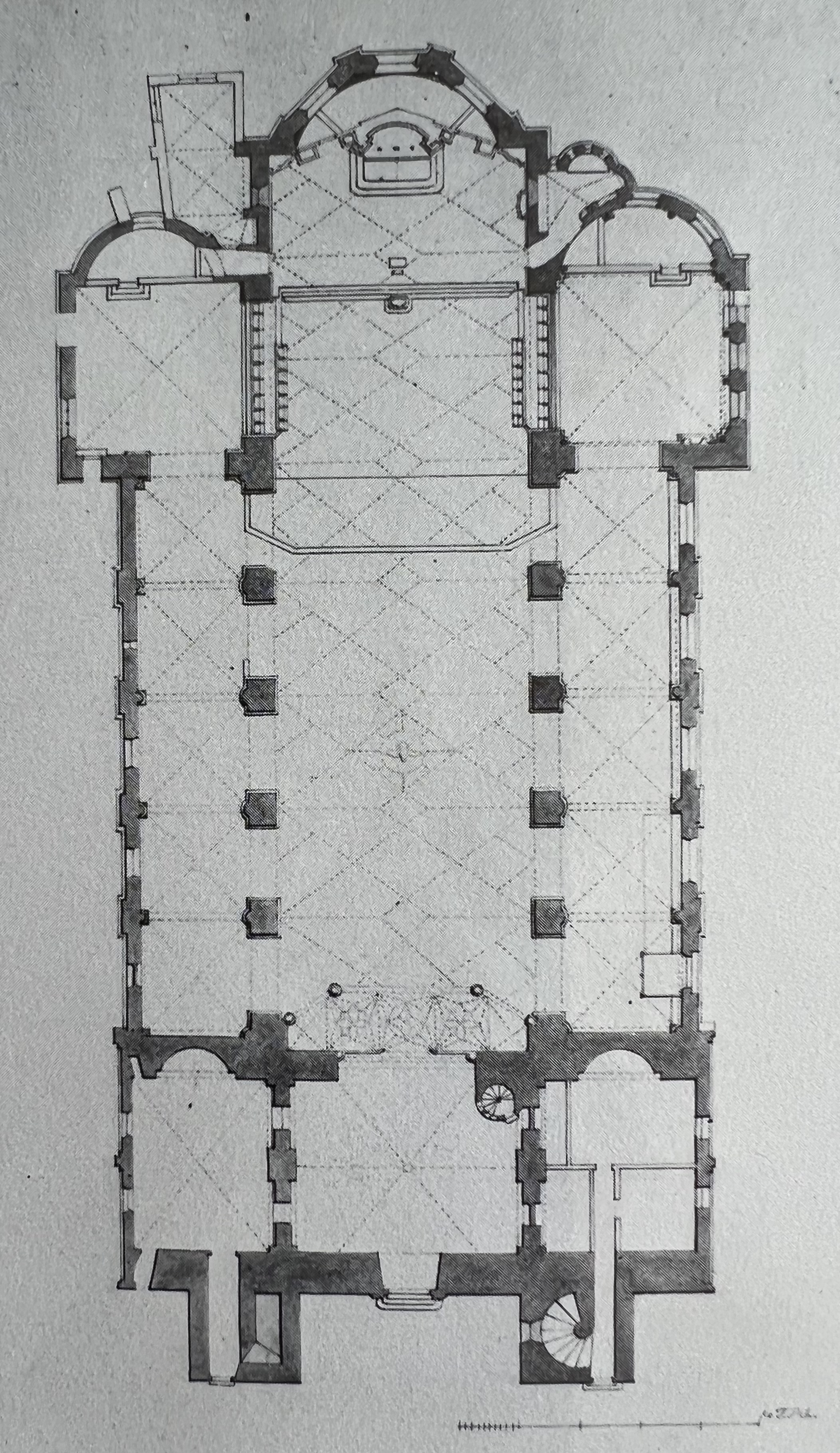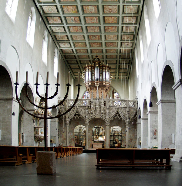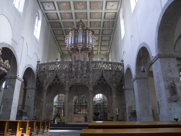 Представляет собой романскую трёхнефную базилику с двумя трансептами. С западной стороны церковь обладает массивным вестверком, состоящим из одной большой башни высотой 36 м и двух малых, но более высоких, 42-метровых башен. С северной стороны к церкви примыкает обширная замкнутая галерея.