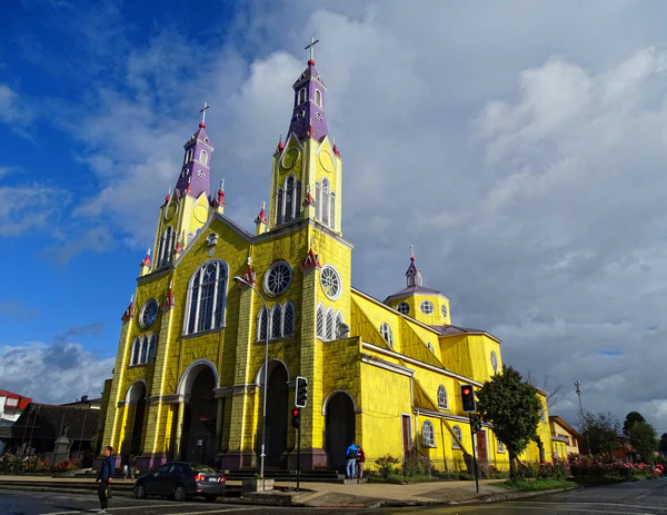 Фасад церкви окрашивают в яркие цвета, что делает его доминантой площади Пласа-де-Армас города Чилоэ[6].