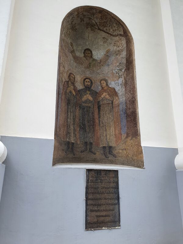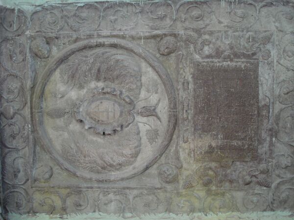 В южной стене церкви на высоте примерно одного метра от пола вделана надгробная металлическая рельефная плита (размером 1,55 м х 2,25 м) конца XVI века. Плита состоит из двух частей: в левой части располагается гербовый картуш, окружённый лавровым венком, листьями аканта и головками ангелов, справа — обрамленная орнаментом кириллическая эпитафия: