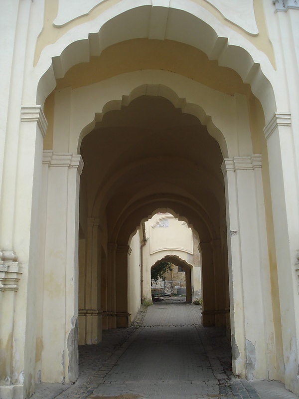 На фронтоне, образующем третий ярус, расположена барельефная композиция в «Святая Троица и шар земной». Фронтон завершают волюты по углам и изогнутый карниз. Арочный проезд перекрыт крестовым сводом. Над ним располагается довольно обширное крытое помещение с балконом.[7][8] В старину на этом балконе помещался оркестр базилианского монастыря для встречи религиозных процессий, которые устраивались по случаю церковных праздников и особенно в день Иосафата (Кунцевича).