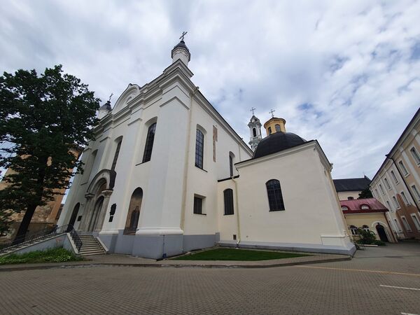 При Свято-Троицком монастыре с XVI века действовал женский монастырь. Монастырь занял здание, в 1609 году перестроенное из трёх соседних готических домов. На средства князей Сапег в 1630 году здание было расширено. Позднее к нему были пристроены два флигеля. Настоятельницей монастыря была дочь Павла Сапеги Екатерина. При женском монастыре находилась небольшая библиотека из книг на польском языке. Женская обитель находилась рядом с мужской, от которой отделялась сначала деревянною оградою, затем каменной стеной, построенной в 1777 году. Помещение монахинь находилось по правую сторону от входа в Троицкий монастырь. Своей церкви в женском монастыре не было, и монахини ходили в Свято-Троицкую церковь через калитку, проделанную у первых ворот. Монахиням женской обители была отдана часовня Воздвижения Святого Креста, пристроенная к церкви по левую сторону от входа. В часовню из женского монастыря вела особая закрытая галерея. Около 1784 года она была разрушена; в 1792 году была построена новая деревянная галерея через колокольню, которая вела в часовню Воздвижения Святого Креста. Тогда же были увеличены окна церкви.