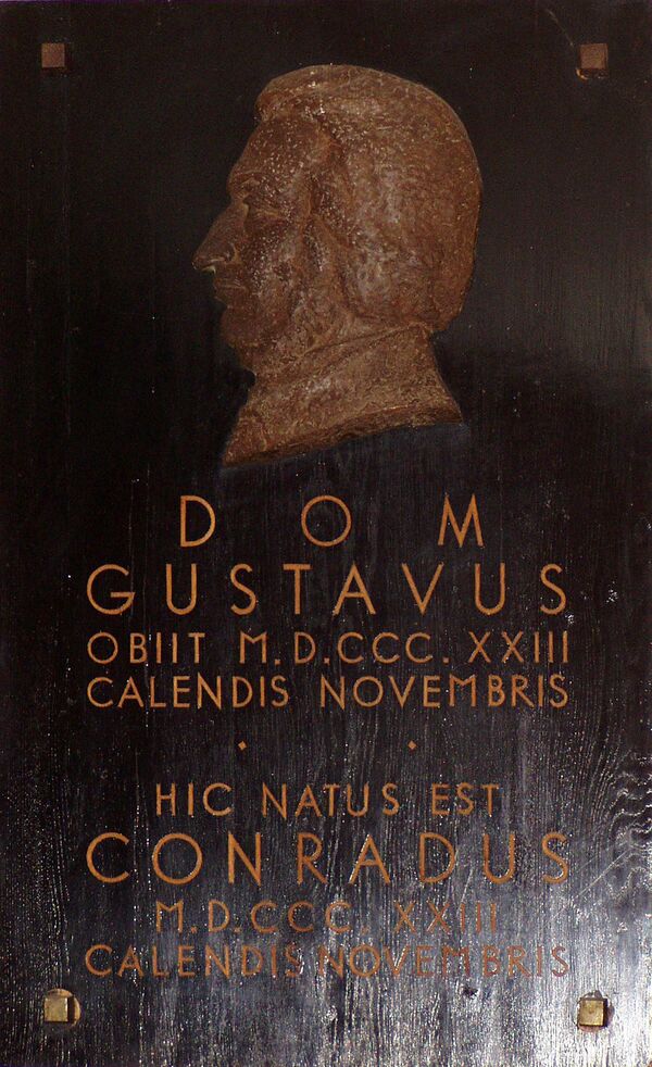 Оригинальный текст (лат.)[показатьскрыть]D. O. M. Gustavus obiit MDCCCXXIII calendis Novembris. Hic natus est Conradus MDCCCXXIII calendis Novembris