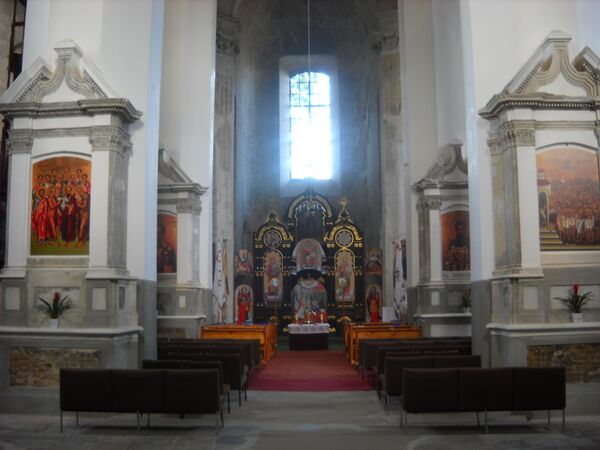 Вместительное пространство храма четырьмя парами пилонов, поддерживающих купол, членится на три нефа почти одинаковой площади. Массивные восьмигранные пилоны увенчаны стукковыми капителями. Стены и своды оштукатурены и побелены; под слоем мела и штукатурки сохранились следы фресок. В церкви сохранились алтарь и орган, по своим формам в стиле классицизма.