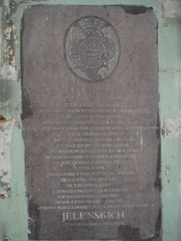 В противоположную северную стену вделана другая плита. На ней по-польски написано, что здесь погребены сестры Еленские, умершие в 1757 и 1758 годах.