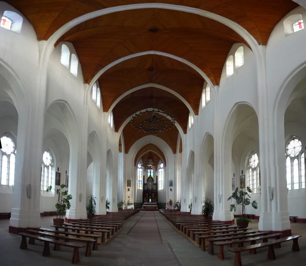 Трансепт храма имеет одинаковую высоту с центральным нефом, который завершается алтарной частью с гранёной апсидой, и более низкими боковыми ризницами.