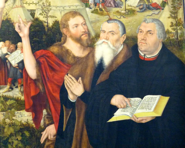 В закрытом виде на внешних сторонах боковых створок изображены библейские сцены Крещения Иисуса и Воскресения. Алтарь также служит надгробным памятником Иоганну Фридриху I Великодушному, заказчику алтаря, его жене Сибилле Клевской и их потомкам, которые похоронены под сводом церкви перед алтарём, причём их имена высечены на пределле в виде эпитафии, а их изображения представлены на боковых створках раскрытого алтаря[11].