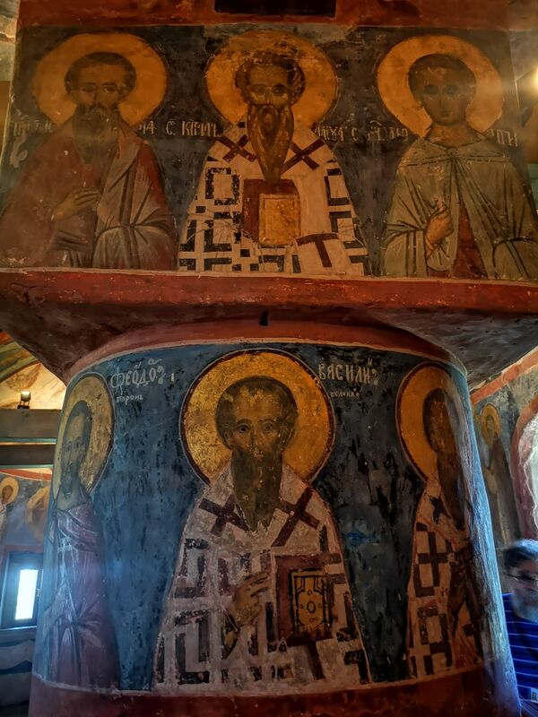 В XVII веке роспись была поновлена в обветшавших местах, и заново написана там, где пришлось сделать перестройки — в куполе, на сводах, в конхе. Тогда же были переписаны ростовые фигуры святых у южного и северного окон. Художники действовали деликатно, стараясь не изменять систему росписи XV века.