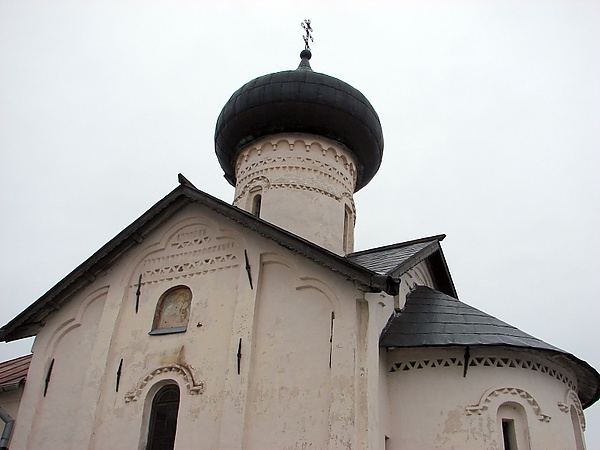 На ктиторской фреске архиепископ Иона держит в руках модель храма с необычным завершением фасадов — шестнадцатискатным, нигде больше в Новгороде не отмеченным. Однако роспись эта поновлена в позднее время (возможно, даже в XVIII веке), а при изучении храма архитекторы-реставраторы не смогли обнаружить следы ни такого, ни какого-то другого завершения. Поэтому сейчас восстановлено восьмискатное завершение, характерное для других новгородских храмов этого периода.