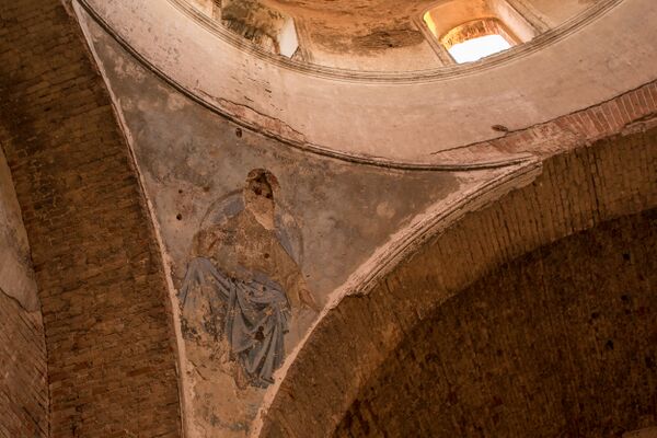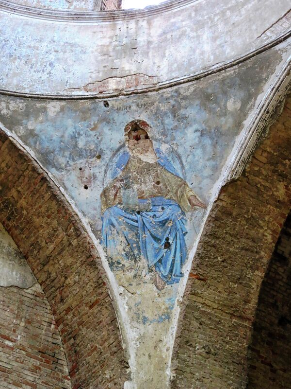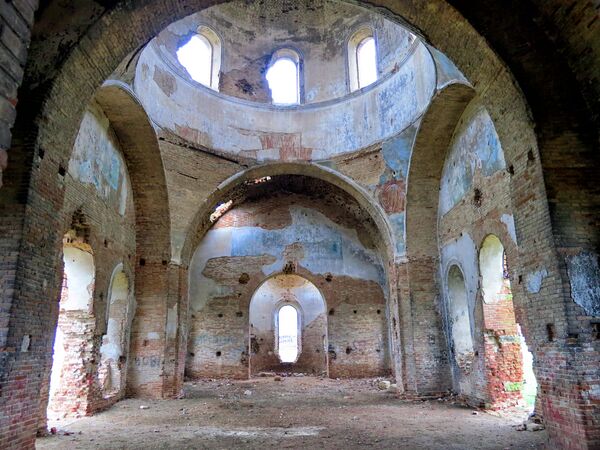 Колокольня снизу разделялась перегородками на коридор, ведущий в церковь и служебное помещение. Интерьер молитвенного зала гармонизирует с венчающим в его центре широким куполом. Храм был покрыт росписями, их фрагменты сохранились в алтарной апсиде и в центре на поддерживающих пандативах. Перед северным и южным входами были широкие четырехколонные портики дорического ордера, гармонирующие с расположенными по сторонам в дверных и оконных проемах пилястрами.