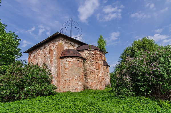 Первая одноглавая каменная церковь на этом месте была построена по благословению архиепископа Мартирия в 1195—1196 годах в стиле псково-новгородской архитектуры XII—XIII веков[1]. В 1386 году храм пострадал от пожара, а к середине XV века рухнул от ветхости. В 1463—1464 года на основании старой церкви была построена новая[2]. В её стенах использовали плинфу и известняковые плиты из старого храма. Западный фасад был богато оформлен декоративными окошками и вмонтированными в стены белокаменными крестами. Храм не имел матроней и эмпоров, был расписан изнутри (небольшие фрагменты росписи на стенах и столбах в уровне пола XIV века сохранились до наших дней).