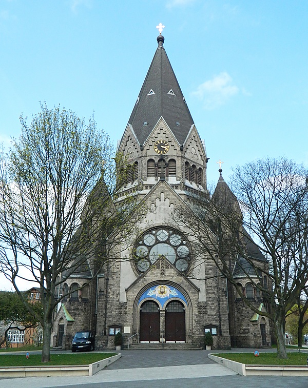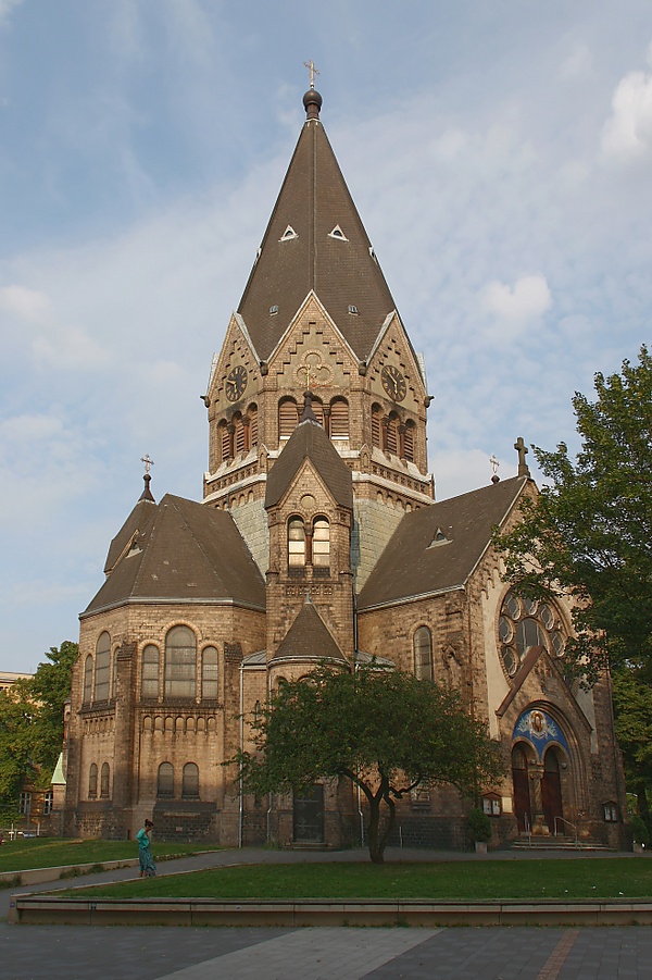 Высота храма — 53 метра. Церковь имеет в плане вид равностороннего креста. Здание выполнено в неороманском стиле, но узнаётся в нём и влиянием восточных храмовых сооружений. На внешней стороне преобладает массивная восьмигранная башня, увенчанная шатровой крышей, вокруг которого образуются несколько часовнеобразных расширений и нефов. Внутреннее пространство также представляет собой восьмиугольник и выровнено эллиптически с главной осью в направлении север-юг[2].