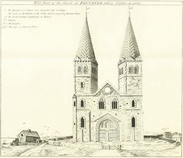 Первое здание, построенное из камня и кирпича, добытого в римском форте, было однонефной базиликой с полукруглой абсидой и небольшими пристройками по северной и южной стороне в месте соединения нефа[b] и алтарной части. В дальнейшем церковь расширялась и пристраивалась. В XII веке добавлены две башни. Последними пристройками стали в XV веке северное и южное крыльцо, ведущие в неф. После этого Рекулвер стал беднеть, а церковь его приходила в упадок. Эрозия берега, которую не могли остановить, привела к тому, что в 1809 году здание было большей частью разобрано.