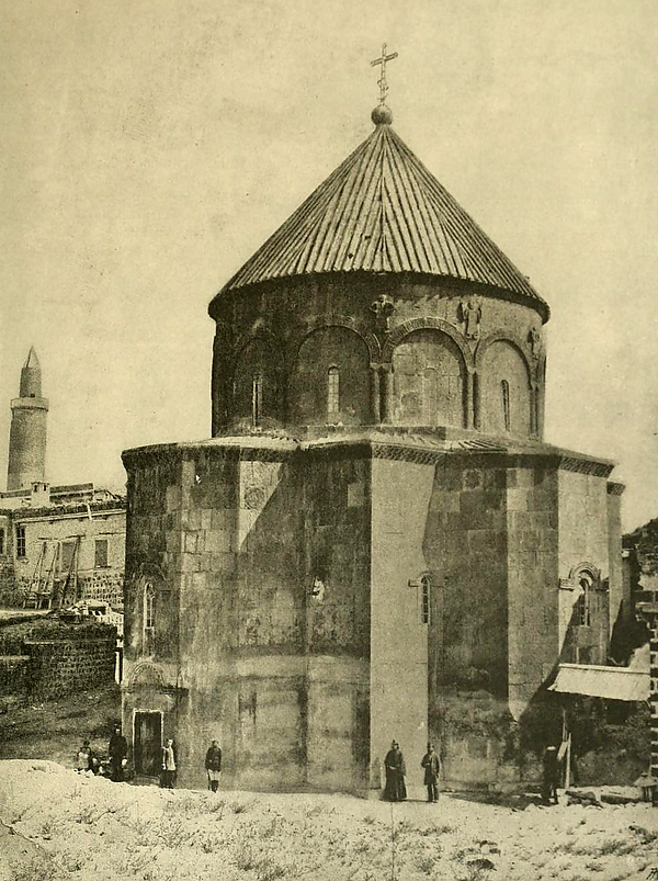 «На пазухах сводов между двенадцатью арками на барабане есть двенадцать фигурных рельефов в стоячем положении. Они выполнены в очень примитивном стиле. Согласно J.M. Thierry, эти фигуры представляют собой двенадцать апостолов, почитание которых пришло из Византии в X—XI веках»[4].