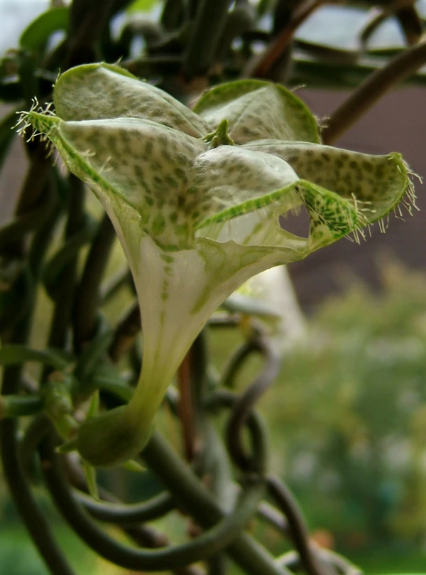 Подвой образует группу длинных, сочных, цилиндрических корней. Стебли многолетние, вьющиеся, высотой до ±2 м, толщиной 5 мм, мясистые, голые, слегка бородавчатые. Листья мясистые, голые; черешок до 6 мм длиной; пластинки яйцевидно-ланцетные до сердцевидно-яйцевидных, 20-50 х 12-25 мм, иногда остро-остроконечные. Цветки 51-102 мм длиной в соцветии на цветоножке, развиты последовательно; цветонос до 10 мм длиной; цветоножки до 10 мм длиной. Чашелистики линейно-продолговатые, острые, 6-7 мм дл. Венчик длиной 40-70 мм; трубка 25-50 мм длиной, с продолговатым базальным вздутием ±6 мм в диаметре, суженная и обычно несколько изогнутая над вздутием, затем расширенная к воронкообразному устью до 15-25 мм в диаметре, с немногочисленными волосками у основания внутри, светло-зелёная на инфляции, с зелёно-белыми полосами сверху; лопасти наверху сросшиеся и раскрывающиеся в 5-килеватую, уплощённую или зонтиковидную крону 25-50 мм в диаметре, от центра верхушечную, поддерживаемую 5 широкими основаниями с широкими отверстиями между ними; край кроны с длинными вибрирующими волосками от белого до пурпурного цвета. Венчик чашеобразный, 1 мм высотой, реснитчатый с белыми волосками; внутренние лопасти, отходящие из тазика, лежачие, прямостоячие, линейно-нитевидные, 3 мм дл. Фолликулы горизонтально расположенные, длиной 75-130 мм, толщиной 7-8 мм, неравномерно-морщинистые и бугорчатые, с пурпурным оттенком[2].