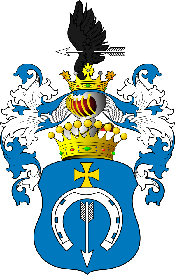 Щит увенчан дворянским коронованным шлемом. Нашлемник: чёрное крыло коршуна, горизонтально пронзенное серебряной стрелой влево. Намёт: лазоревый с серебром.