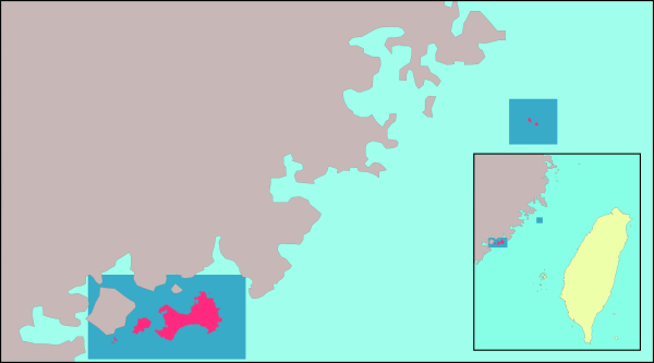 Состоят из острова Цзиньмыньдао[2] (Куэмой[4]) (где проживает большинство населения), гораздо меньшего, но тоже населённого острова Сяоцзиньмыньдао[5] (кит. трад. 小金門島), он же Малый Куэмой[6], остров и одноимённый посёлок Лиюй[7] и ряда мелких островков, не имеющих постоянного гражданского населения.