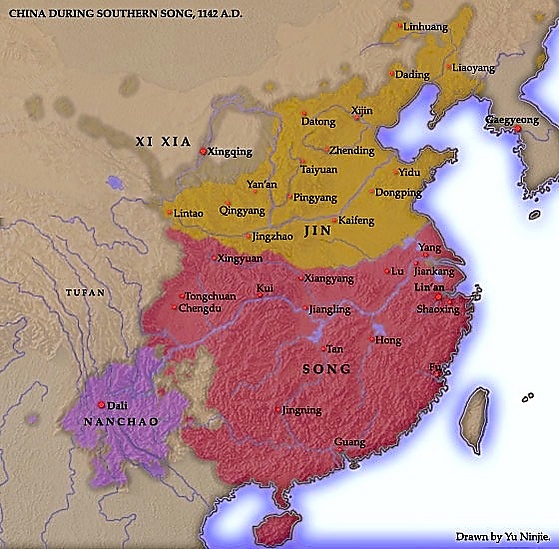В 1127 году чжурчжэни захватили Кайфэн, включив в своё государство север Китая. Бывший император Сун Хуэйцзун (поспешно отрёкшийся от престола) с сыновьями, гаремом и челядью были угнаны в плен, а на захваченной территории чжурчжэнями было создано марионеточное государство Чу. Однако правитель Чу передал власть представителю империи Сун, и чжурчжэням пришлось создавать новое вассальное государство — Ци, некоторое время воевавшее вместе с ними против империи Сун. Сунский полководец Юэ Фэй продолжал сражения с чжурчжэнями вплоть до своей гибели и подписания Шаосинского договора в 1142 году, согласно которому Цзинь получала территории к северу от реки Хуайхэ.