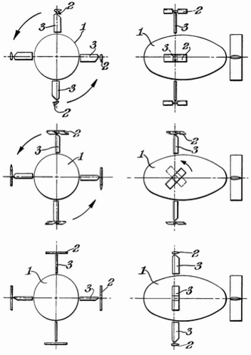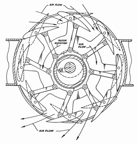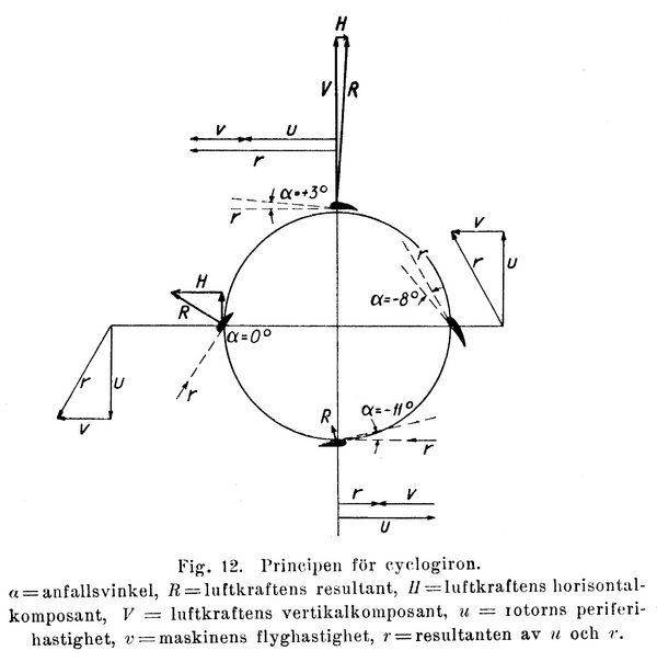 В 1975 году во Франции (патент Франции № 75.01907), а в 1976—1977 годах в США (US patent 4048947), был запатентован роторный ветродвигатель основанный на цикложирном принципе. Здесь изменение угла атаки происходит автоматически под воздействием самого ветра из-за смещения центра тяжести (однако предусмотрено также использование гибких пластин для создания несимметричного профиля, возможно и использование пружин). Однако для создания летательного аппарата это решение непригодно[4].