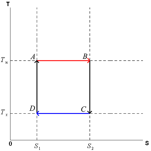 Цикл Карно состоит из четырёх обратимых стадий, две из которых осуществляются при постоянной температуре (изотермически), а две — при постоянной энтропии (адиабатически). Поэтому цикл Карно удобно представить в координатах (температура) и (энтропия).
