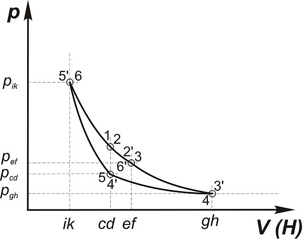 5. Тело B удалено, продолжается сжатие воздуха; воздух, будучи изолирован, повышает свою температуру. Сжатие продолжается до тех пор, пока воздух не достигнет температуры тела A. Поршень при этом переходит из положения cd в положение ik.