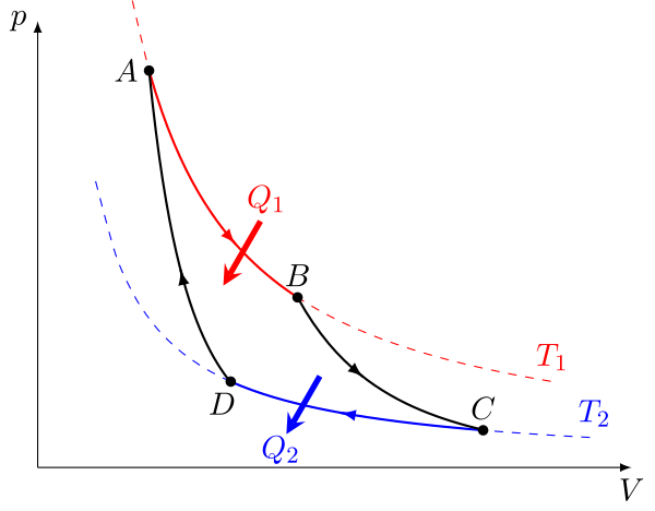 1. Изотермическое расширение (на рис. 1 — процесс A→B). В начале процесса рабочее тело имеет температуру , то есть температуру нагревателя. При расширении рабочего тела его температура не падает за счёт передачи от нагревателя количества теплоты , то есть расширение происходит изотермически (при постоянной температуре) . При этом объём рабочего тела увеличивается, оно совершает механическую работу, а его энтропия возрастает.