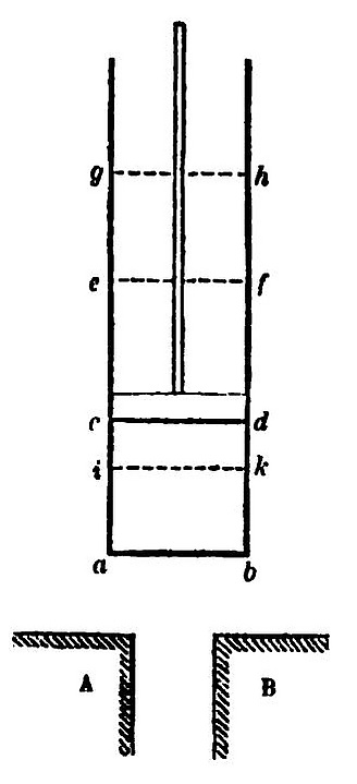…Вообразим упругий флюид (в переводе — «жидкость»), например, атмосферный воздух, заключённый в цилиндрический сосуд abcd (см. оригинальный рисунок Сади Карно), закрытый подвижной диафрагмой или поршнем cd. Кроме того, предположим два тела A и B, поддерживаемые оба при постоянной температуре, причём A — при более высокой, чем B, затем вообразим следующий ряд операций.