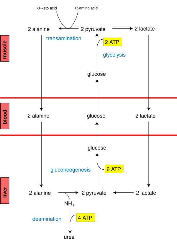 Поскольку скелетные мышцы не могут использовать цикл мочевины для безопасной утилизации ионов аммония, образующихся при распаде аминокислот с разветвленной цепью, они должны избавляться от них другим способом. Для этого аммоний соединяется со свободным α-кетоглутаратом посредством реакции трансаминирования в клетке с образованием глутамата и α-кетокислоты. Аланинаминотрансфераза (АЛТ), также известная как глутамин-пировиноградная трансаминаза (ГПТ), затем превращает глутамат обратно в α-кетоглутарат, на этот раз переводя аммоний в пируват, образующийся в результате гликолиза, с образованием свободного аланина. Аминокислота аланин действует как челнок — она покидает клетку, попадает в кровоток и перемещается к гепатоцитам в печени, где, по сути, весь этот процесс происходит в обратном порядке. Аланин подвергается реакции переаминирования со свободным α-кетоглутаратом с образованием глутамата, который затем дезаминируется с образованием пирувата и, в конечном счете, свободного иона аммония. Гепатоциты способны метаболизировать токсичный аммоний в цикле мочевины, тем самым безопасно избавляясь от него. Успешно избавив мышечные клетки от иона аммония, цикл затем снабжает лишенные энергии клетки скелетных мышц глюкозой. Пируват, образующийся в результате дезаминирования глутамата в гепатоцитах, подвергается глюконеогенезу с образованием глюкозы, которая затем может поступать в кровоток и доставляться в ткани скелетных мышц, таким образом обеспечивая их необходимым источником энергии[6].