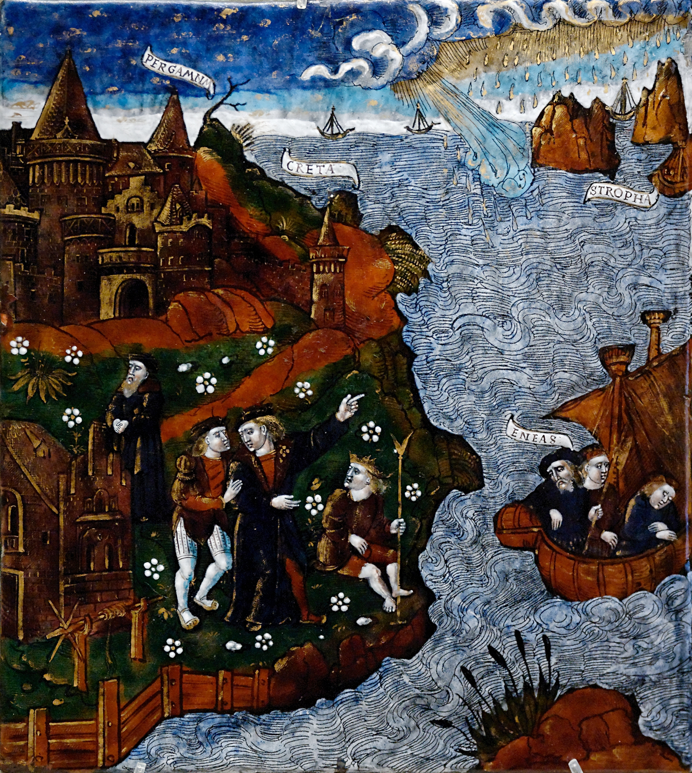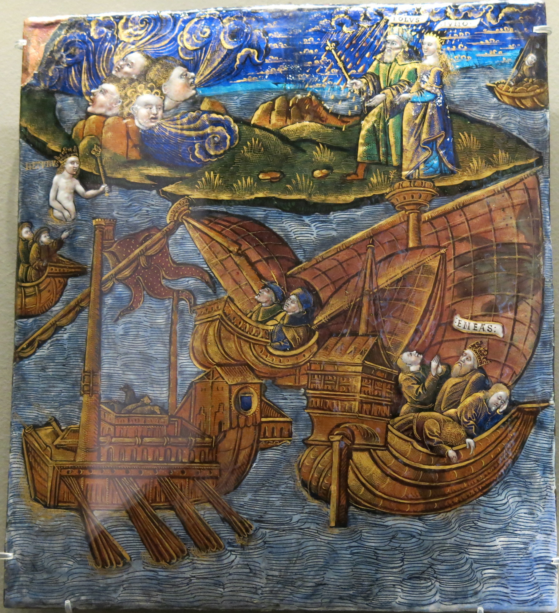 Юнона и Эол изображены стоящими друг рядом с другом, в верхней правой части картины, в одежде эпохи Мастера Энеиды. Скипетром Эол освобождает ветры, изображённые в виде дующих в разные стороны четырёх голов. Занимающее две трети картины море подчёркивает опасность предпринятого Энеем путешествия. Несмотря на надутые паруса кораблей, морская поверхность спокойна — так Энею и его товарищам помогает изображённый в верхнем левом углу картины Нептун. | |