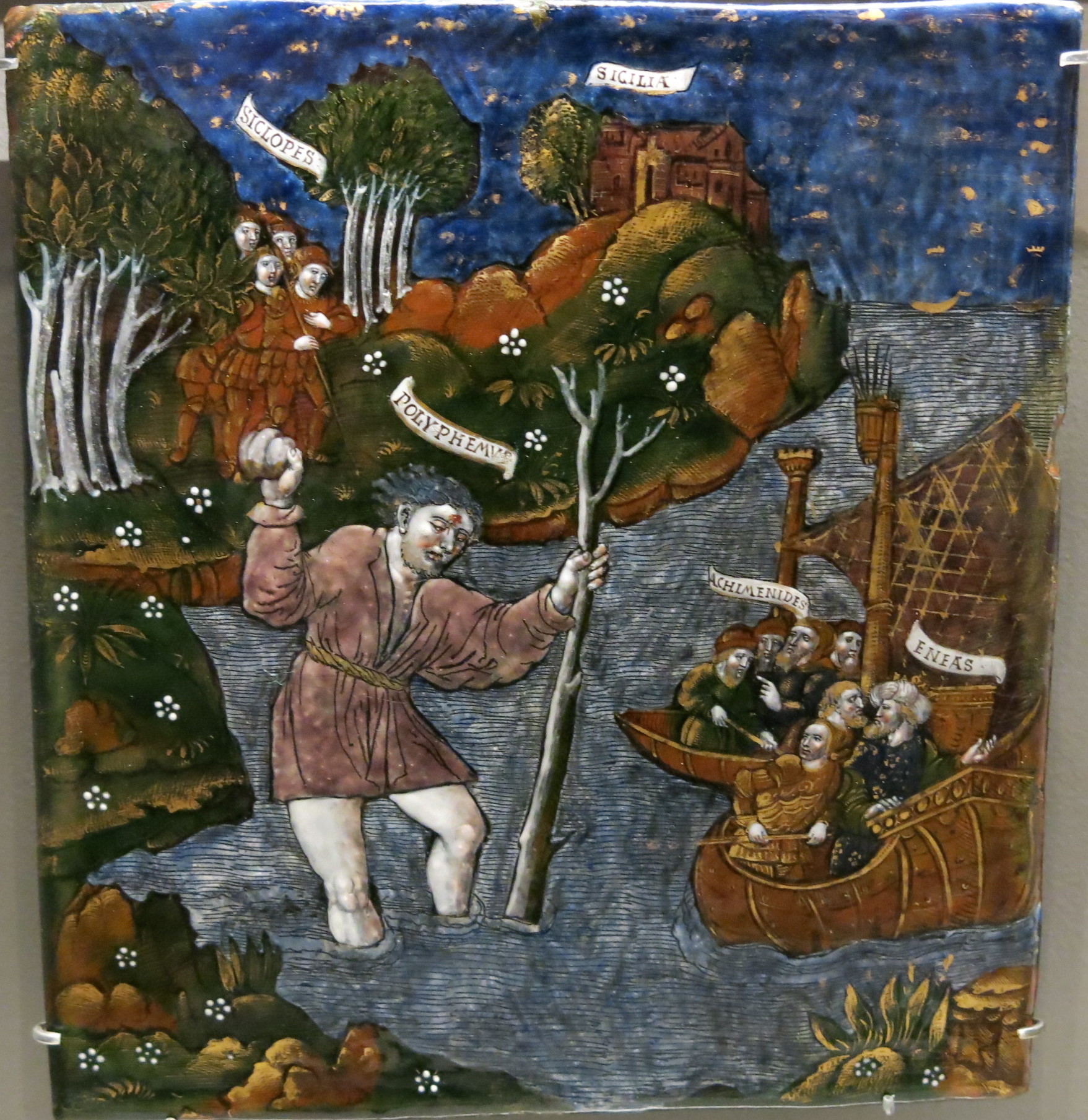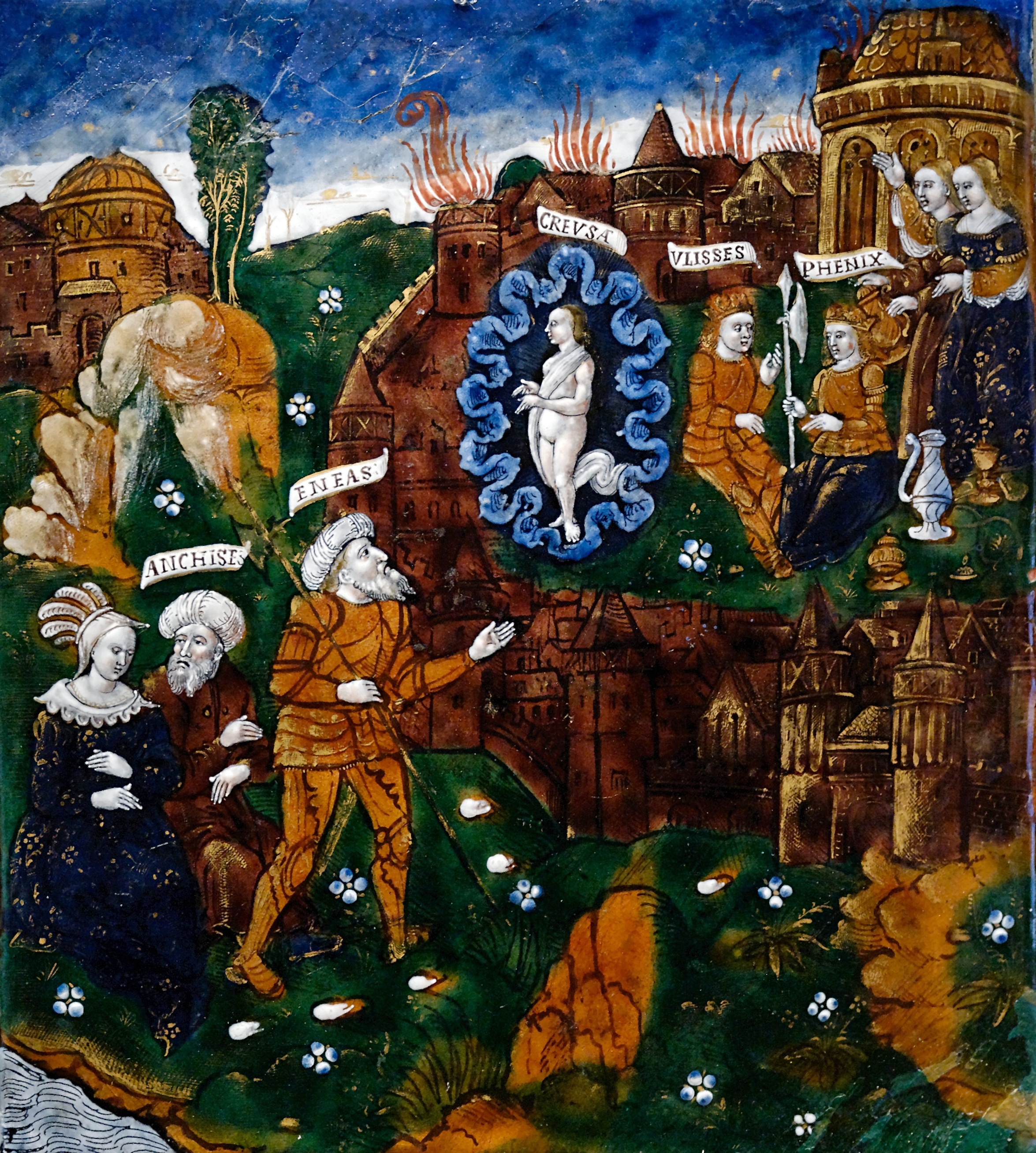 Башни изображённой в правом верхнем углу картины Трои объяты пламенем. Город занят ахейцами — внутри городских стен изображены Одиссей (он подписан латинизированным вариантом своего имени — «Улисс») и Феникс. Одетый в доспехи Эней оставляет своего отца Анхиса и возвращается в город. Над городской стеной появляется призрак Креусы — супруга Энея изображена с символизирующим смерть синим галом. Нагота Креусы говорит о том, что она уже принадлежит миру богов. | |