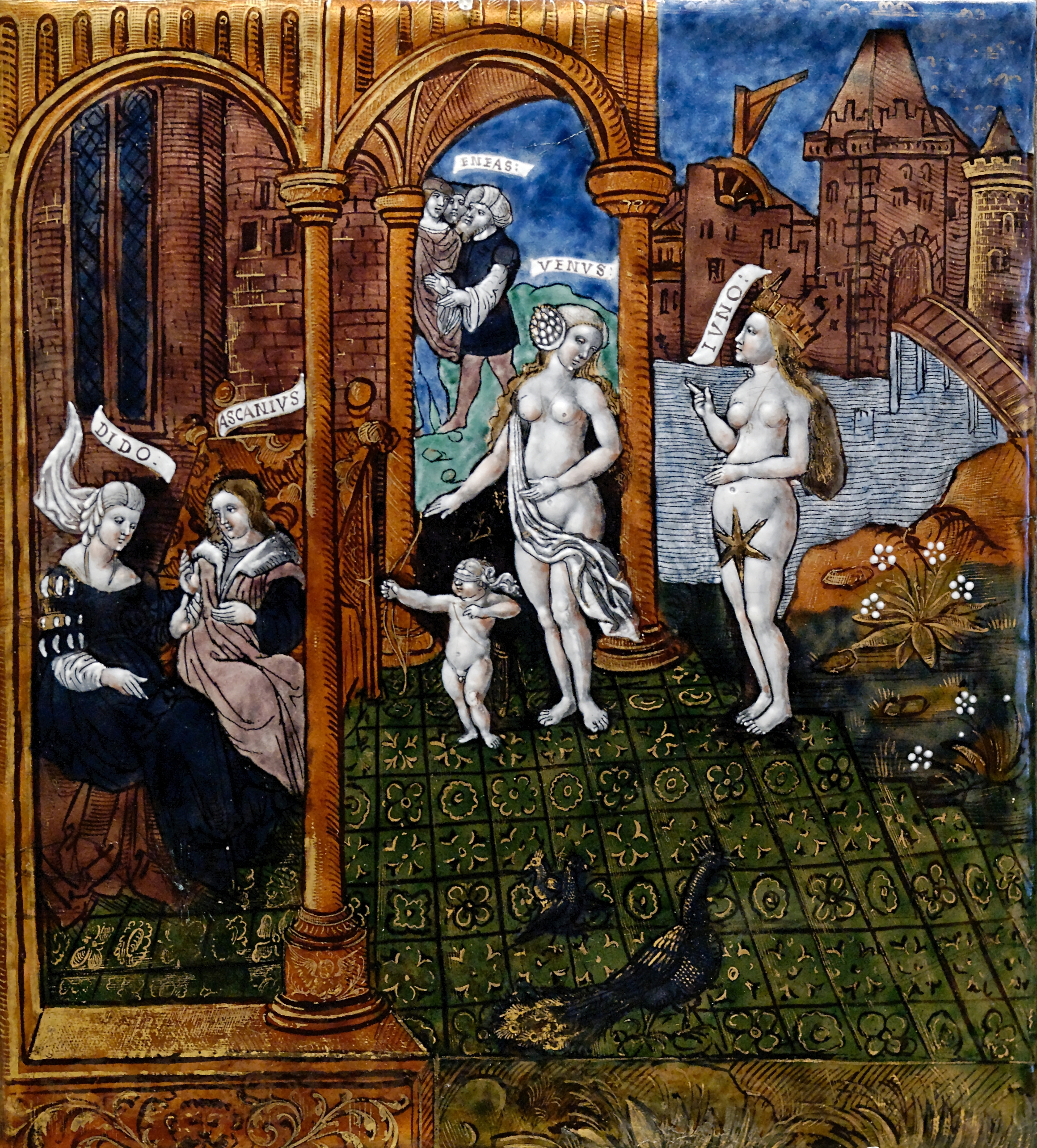 Влюблённая в Энея Дидона изображена сидящей во дворце, рядом с сыном Энея Асканием. Рядом стоят две обнажённые, изображённые на манер античных статуй богини: Юнона, рассчитывающая на то, что любовь заставит Жнея задержаться в Карфагене, и Венера, притворяющаяся, что разделяет планы Юноны. У ног Венеры — её сын Купидон, он целится из лука в сидящую во дворце пару. Художник примешивает к изображённой сцене детали из другого эпизода поэмы Виргилия: во время прибытия Ахата в Карфаген, Венера сказала Купидону принять черты Аскания и соблазнить Дидону, дабы обеспечить тёплый приём прибывавшим позже Энею и его сыну. Сам Эней изображён на заднем плане, за дворцом Дидоны. Ещё дальше виднеются стены и башни Карфагена. | |