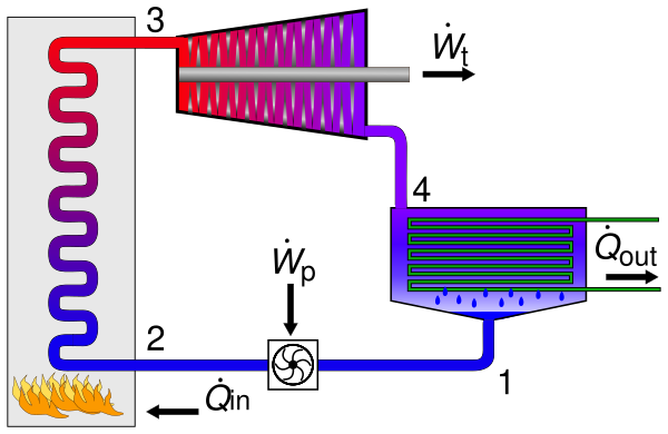 Цикл Ренкина используется также в радиоизотопных электрогенераторах, а обратный цикл Ренкина - самый распространенный цикл холодильной машины, по которому работают компрессорные холодильные машины (холодильники, кондиционеры, чиллеры, и так далее)