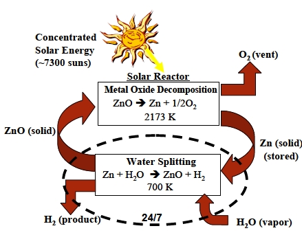 На первом эндотермическом этапе используется концентрация солнечной энергии, при которой оксид цинка термически диссоциирует при 1900 С на цинк и кислород. На второй экзотермической стадии, не связанной с солнечной энергией, цинк реагирует при 427 С с водой и производит водород и оксид цинка. Температурный уровень достигается за счет использования солнечной энергетической башни и набора гелиостатов для сбора солнечной тепловой энергии.