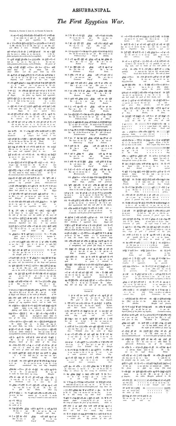 В первом походе я выступил против Магана, Мелуха, Тахарки, царя Египта и Эфиопии, которого победил Асархаддон, царь Ассирии, отец, породивший меня, и чью землю он подчинил своей власти. Этот же Тахарка забыл о могуществе Ашшура, Иштар и других великих богов, мои господа, и положился на свою силу. Он выступил против царей и регентов, которых мой отец назначил в Египте. Он вошёл и поселился в Мемфисе, городе, который мой отец завоевал и включил в состав ассирийской территории". Рассамский цилиндр Ашшурбанапала (отрывок)[6]
