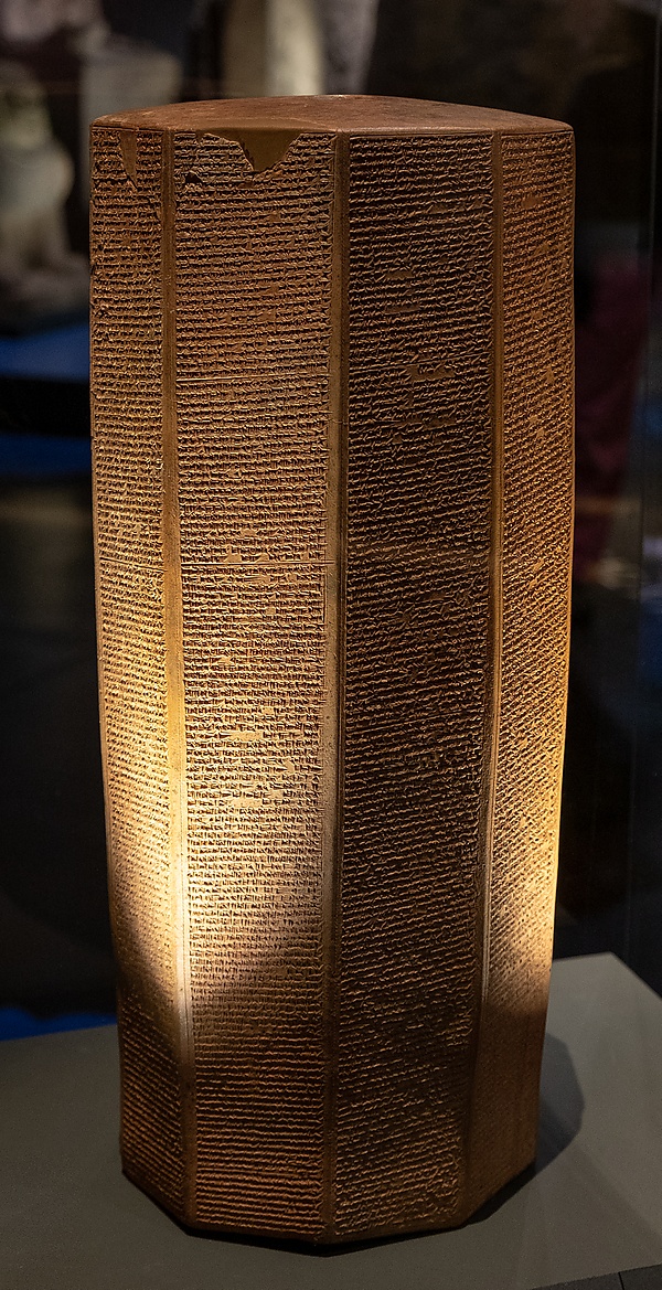 Известно также несколько рельефов из Ниневии, иллюстрирующих эти походы[7]. Полный перевод цилиндра на английский язык был сделан Дэниелом Лакенбиллом в «Древних записях Ассирии и Вавилонии»[2]. Полная транскрипция клинописи доступна на CDLI (цифровая библиотека с клинописью)[8].
